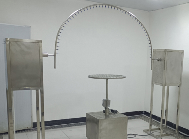 樣品放置:將樣品放在試驗臺上面,使其噴水口的距離樣品表面約200mm,試驗轉臺不旋轉。 試驗條件:擺管夾角120°噴水孔噴水噴向樣品。樣品放在擺管半圓中心。揮管兩邊各擺動60°,共120°。每次擺動(2×120°)約4s。